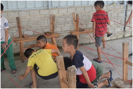 運(yùn)動(dòng)會(huì)圍繞“趣味”開(kāi)展,把國(guó)學(xué)知識(shí)與當(dāng)?shù)貍鹘y(tǒng)文化融進(jìn)游戲中,在充分考慮孩子們的興趣、體能的基礎(chǔ)上,志愿者們?cè)O(shè)計(jì)了寓教于樂(lè)、智體合一的活動(dòng)項(xiàng)目?简(yàn)漢字書(shū)寫功底的“遨游天際”紙飛機(jī)放飛項(xiàng)目,考驗(yàn)快速口算能力的“珠聯(lián)數(shù)合”,考察詩(shī)詞成語(yǔ)等基本文化素養(yǎng)的“三人游”、“趣味投壺”、“障礙賽”等比賽項(xiàng)目深受孩子們喜歡!叭の锻秹亍北荣愂歉鶕(jù)古時(shí)雅士宴飲游戲結(jié)合當(dāng)?shù)毓乓鉂夂竦拇屣L(fēng)設(shè)計(jì)的,孩子們?cè)趬厍耙桓幕顫姾脛?dòng)的特點(diǎn),凝神靜氣、不急不躁、耐心瞄準(zhǔn)壺口,頗有“君子無(wú)所爭(zhēng),其爭(zhēng)也君子”的模樣。這個(gè)項(xiàng)目不僅鍛煉耐性,還讓孩子們親身體會(huì)了傳統(tǒng)文化的精髓,對(duì)謙讓有禮的傳統(tǒng)美德有了更深認(rèn)識(shí)。