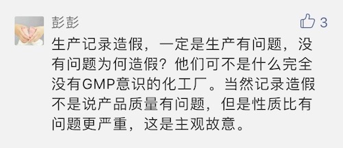 也有網(wǎng)友認(rèn)為:“生產(chǎn)記錄造假一定是生產(chǎn)有問題,沒問題為什么造假?他們可不是沒有GMP意識(shí)的化工廠。當(dāng)然記錄造假不是說產(chǎn)品質(zhì)量有問題,但是性質(zhì)比問題更嚴(yán)重,這是主觀故意!