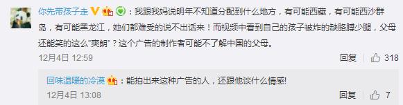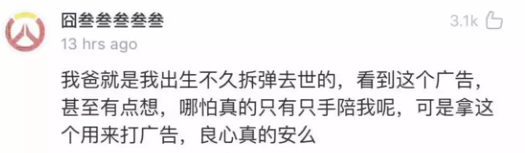 @囧叁叁叁叁叁:我爸就是我出生不久拆彈去世的,看到這個(gè)廣告,甚至有點(diǎn)想,哪怕真的只有只手陪我呢,可是拿這個(gè)來(lái)打廣告,良心真的安么?