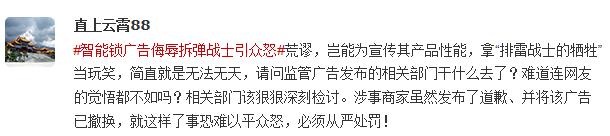 引發(fā)爭(zhēng)議的廣告是“凱迪仕智能鎖”雙11期間推出的。網(wǎng)友認(rèn)為該廣告涉嫌侮辱排雷戰(zhàn)士,紛紛聲討:利欲熏心,無(wú)底線,無(wú)下限,要是不肅清,對(duì)不起那么多流血犧牲的英雄!