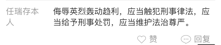 強(qiáng)國(guó)論壇網(wǎng)友“任瑞存本人”:侮辱英烈轟動(dòng)趨利,實(shí)屬惡意踐踏正義,須要受到法治懲戒,須要接受道德警示。