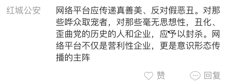 網(wǎng)友“紅城公安”:網(wǎng)絡(luò)平臺(tái)不僅是營(yíng)利性企業(yè),更是意識(shí)形態(tài)傳播的主陣地,應(yīng)拿出基本責(zé)任感,傳播國(guó)家和民族的優(yōu)秀文化傳統(tǒng)。