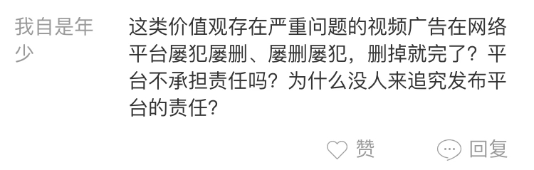 網(wǎng)友“我自是年少”:這類價(jià)值觀存在嚴(yán)重問題的視頻廣告在網(wǎng)絡(luò)平臺(tái)屢犯屢刪、屢刪屢犯,刪掉就完了?平臺(tái)不承擔(dān)責(zé)任嗎?